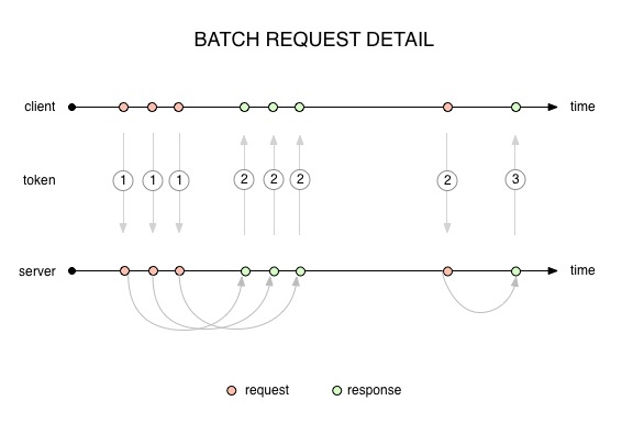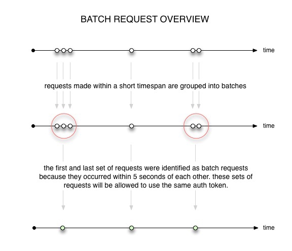 In this case, it's impossible to update the access-token header for the second request with the access-token header of the first response because the second request will begin before the first one is complete. The server must allow these batches of concurrent requests to share the same auth token. This diagram illustrates how batch requests are identified by the server: