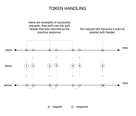 Tokens should be invalidated after each request to the API. The following diagram illustrates this concept:
